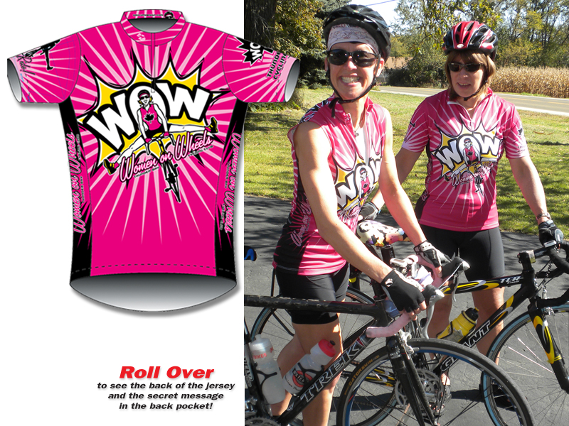 Women on Wheels (W.O.W.) jersey design for an all women's bicycling group in Thunder Bay, Ontario Canada. To see the back view, roll over the image or go here.